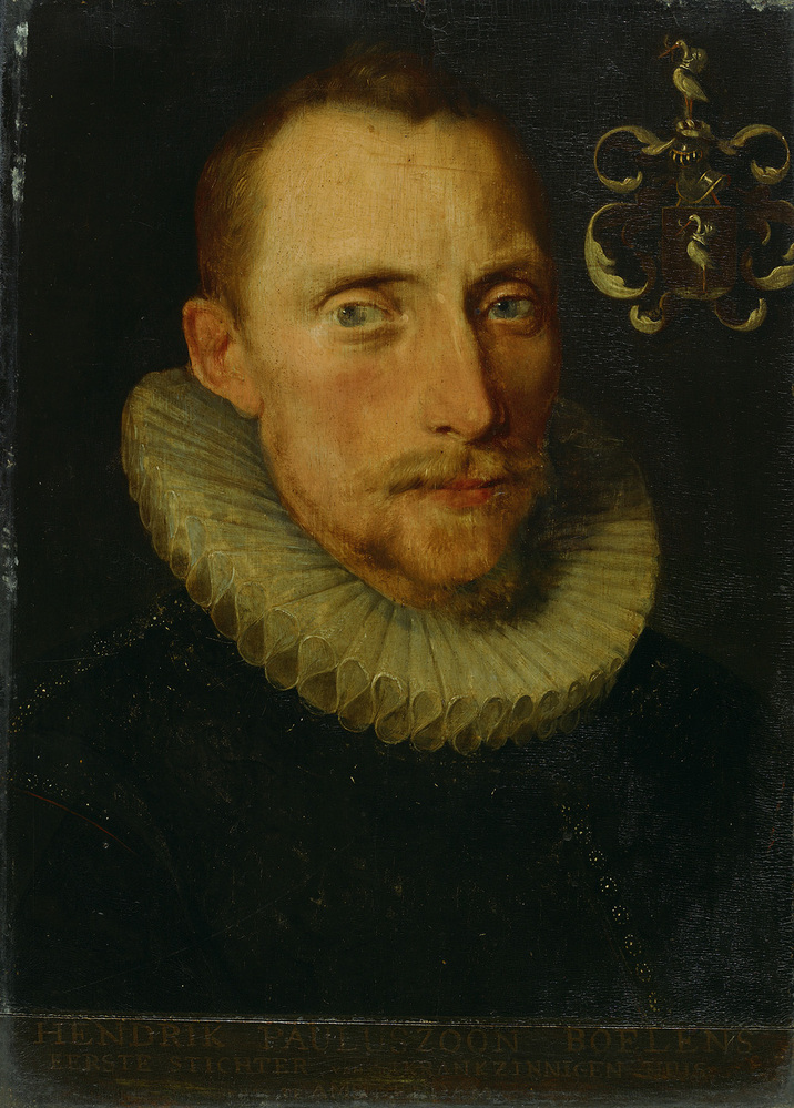 Rechts boven een wapen, waarin twee maal een ooievaar voorkomt. Het lijkt authentiek. Op de plint onder de figuur: HENDRIK PAULUSZOON BOELENS, EERSTE STICHTER VAN T KRANKZINNIGEN HUIS TE AMSTERDAM (lijkt niet origineel). Ter Gouw zegt over deze identificatie: "bewijs ontbreekt", maar spreekt wel over Wagenaars vermelding van het stuk: "Ook hangt hier (in de Regentessekamer van het Dolhuis) .. een geschilderd afbeeldsel van den Stigter, Henrick Pauluszoon Boelens" (Ter Gouw; Wagenaar). Oudere stadsbeschrijvers van Amsterdam vermelden dezelfde naam, als zij de stichter van het Dolhuis ter sprake brengen (zie: Ter Gouw).