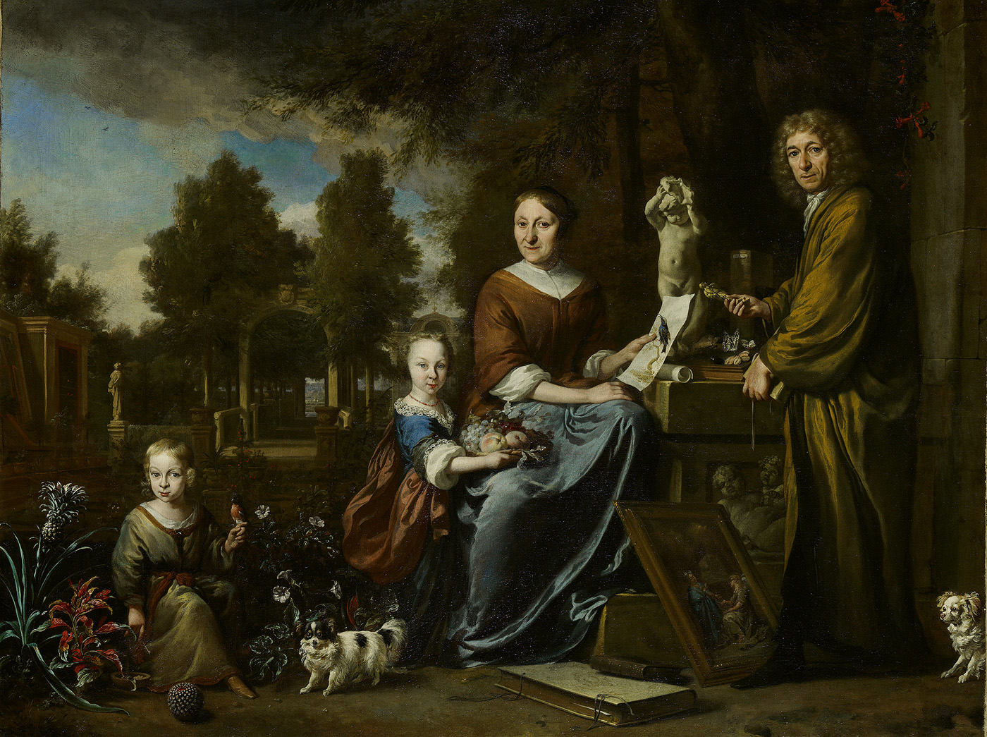 Agnes Block (1629–1704) is geportretteerd samen met haar tweede echtgenoot, de zijdehandelaar Sybrand de Flines (1623–1697), en twee kinderen. Sinds 1676 woonde Agnes Block op haar buitenplaats Vijverhof aan de Vecht, waar zij een botanische tuin had aangelegd. Zo lukte het haar om ananas te kweken - hier geheel links - nadat deze vrucht in 1680 uit Suriname was ingevoerd. Ook fokte zij vogels en liet deze afbeelden. Op de achtergrond zijn een volière en een broeikas te zien. De attributen op en rond de tafel verwijzen naar de interesse van het echtpaar in kunst en naturalia. Jan Weenix werkte in Utrecht en Amsterdam. Evenals zijn vader Jan Baptist Weenix schilderde hij vooral jachtstillevens, landschappen en portretten.