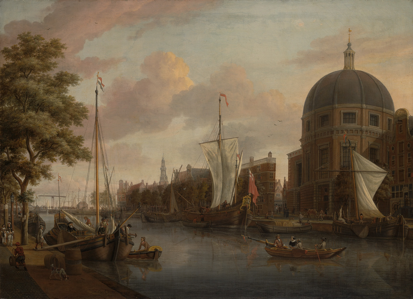 Links verschaft de Haarlemmersluis de toegang van het Singel tot het IJ. Kleine vaartuigen zoals beurtschepen, los- en laadschepen, voeren door deze sluis het Singel op om hun goederen af te leveren. De meeste pakhuizen en markten lagen om die reden aan de grachten. De Ronde Lutherse Kerk was de tweede grote kerk voor de lutherse gemeente in Amsterdam. Als gebaar aan zijn geloofsgenoten hief de koning van Zweden geen belasting op de uit zijn land uitgevoerde platen koper. In het midden is de Haringpakkerstoren te zien. Deze werd in 1829 afgebroken.
