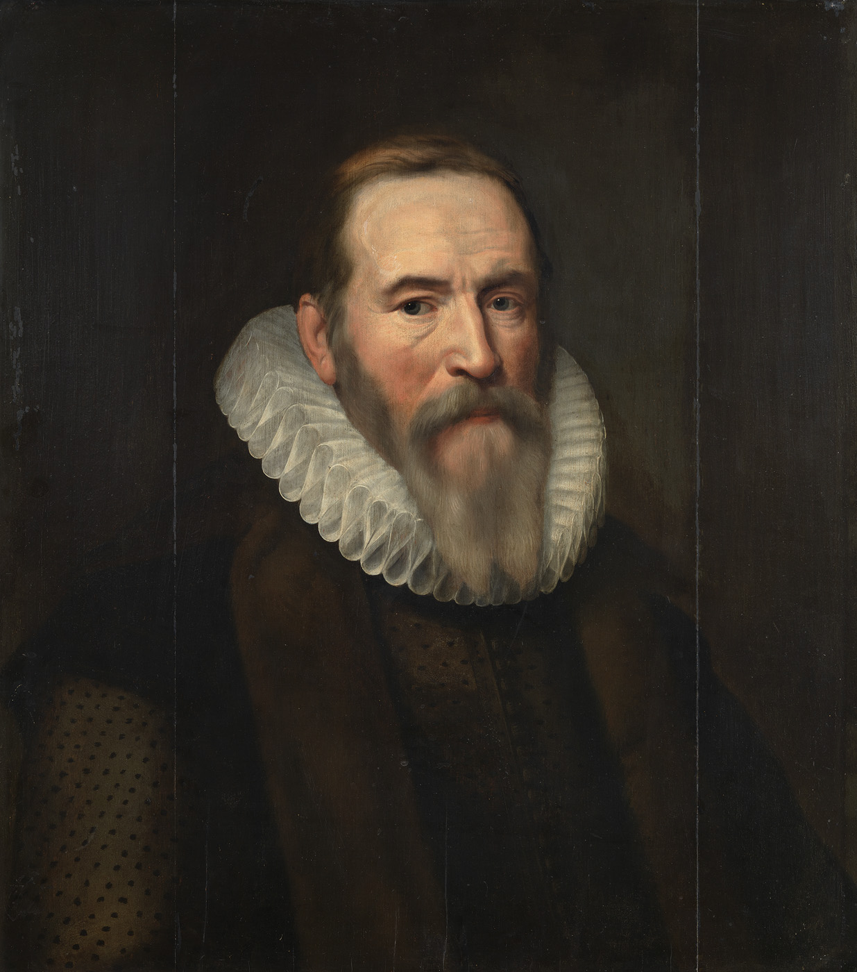 Jan van Oldenbarneveldt leefde van 1547 tot 1619. "Met de machtige Raadpensionaris van Holland stond Amsterdam op gespannen voet. Toen deze door de onmogelijkheid van een alliantie met Frankrijk, voorstander werd van vredesonderhandelingen met Spanje, vond hij daarin Amsterdam scherp tegenover zich. Uit handelsbelang, vooral met het oog op de kaapvaart, behoorde de stad tot de oorlogspartij. Na de sluiting van het bestand in 1609 verbitterde de wederzijdse verhouding, hetgeen tot uiting kwam in de tegenwerking van Amsterdam bij Oldenbarnevelts fiscale maatregelen. Een dieptepunt werd bereikt toen de rechtzinnigen in 1617 het roer van de Amsterdamse stadsregering overnamen. Hun leider, Reinier Pauw, behoorde tot Oldenbarnevelts rechters" (cat. tent. 1967). ( Albert Blankert)