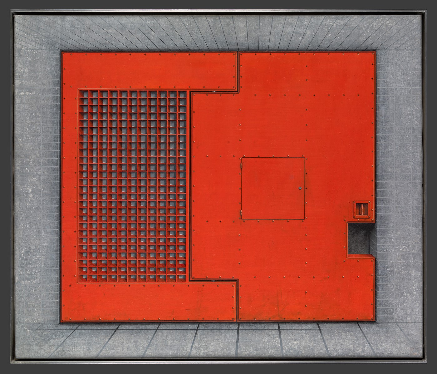 Tussen één uur ’s nachts en half zes ’s morgens zijn de hekken van de metrostations langs de oost-lijn hermetisch gesloten. Ook het hek van het Weesperpleinstation. Met veel aandacht voor detail portretteert Zuyderland het draaihek, maar laat weg wat voor hem overbodig is. De toeschouwer wordt het schilderij ingezogen door het oranje vlak dat in een strak kader is geplaatst met een aanduiding van perspectief. Het hekwerk, de handgreep en de klinknagels zijn bijna tastbaar weergegeven. ( Anneke van de Kieft)