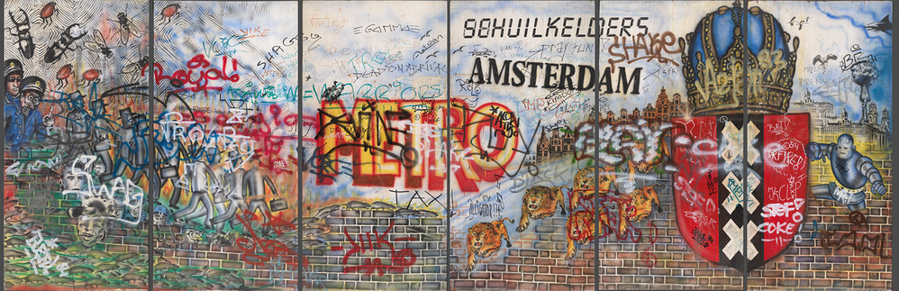 Van 1983 tot 1985 staat op het Waterlooplein een 60 meter lange schutting beschilderd door Hugo Kaagman. Daarachter ligt het bouwterrein waar het nieuwe gebouw van het stadhuis en de opera verrijst. Het is de tijd van het doemdenken, economische crisis, werkloosheid en de angst voor kernwapens. Dat verwerkt Kaagman in zijn beeldverhaal. In die jaren dat de schutting op het Waterlooplein staat voegen veel voorbijgangers er teksten en handtekeningen aan toe. ( Anneke van de Kieft)