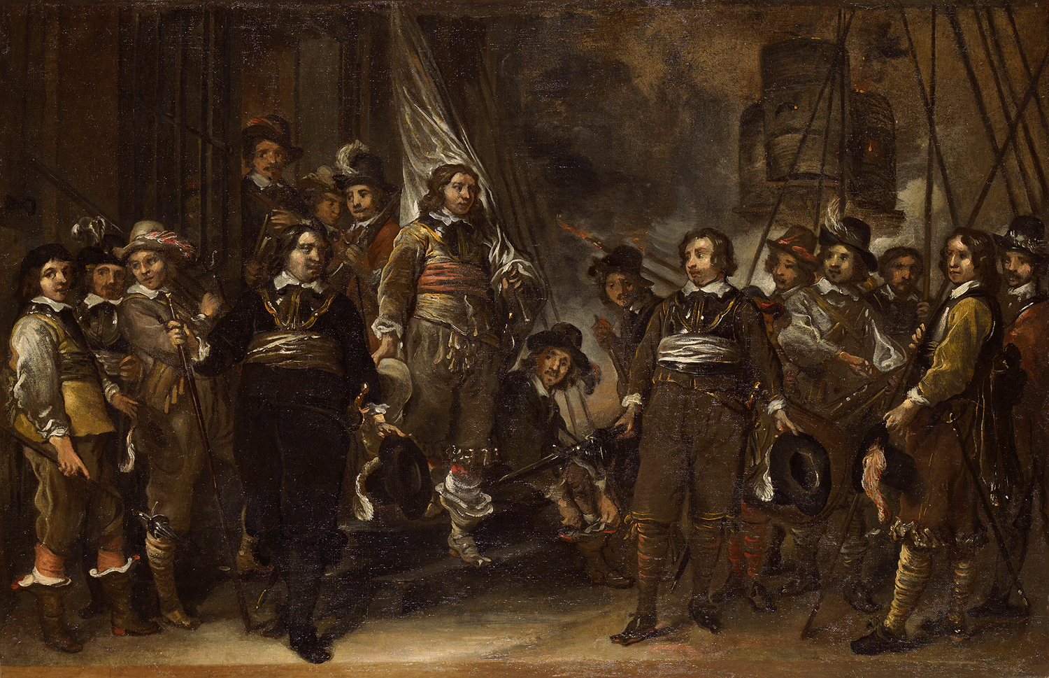 Waveren (1619-1659), die zijn hoed voor Huydecoper afneemt en zijn manschappen presenteert. Nicolaes Oetgens van Waveren, de broer van