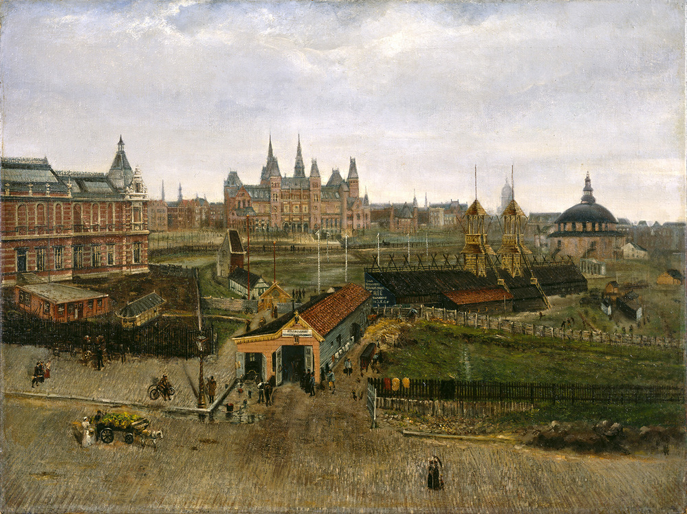 Hier is het huidige Museumplein te zien, met links het nieuwe Stedelijk Museum. Tot 1940 heet het Museumplein het 'IJsclubterrein', omdat het terrein werd geëxploiteerd door de Amsterdamsche IJsclub. Het langwerpige, donkere gebouw met twee torentjes erop, recht tegenover het Rijksmuseum in de achtergrond, is de tribune van de IJsclub. Tussen de tribune en het Rijksmuseum ligt de ijsbaan, die in de zomer ook als wielerbaan of voor evenementen kon worden gebruikt. Dat verklaart ook waarom wij hier nog wat gebouwen zien staan die werden neergezet voor de Wereldtentoonstelling van het Hotel- en Reiswezen van 1895. Op het Museumplein werd Jaap Eden in 1893 de eerste Nederlandse wereldkampioen schaatsen over vier afstanden. ( Sarah Remmerts de Vries)