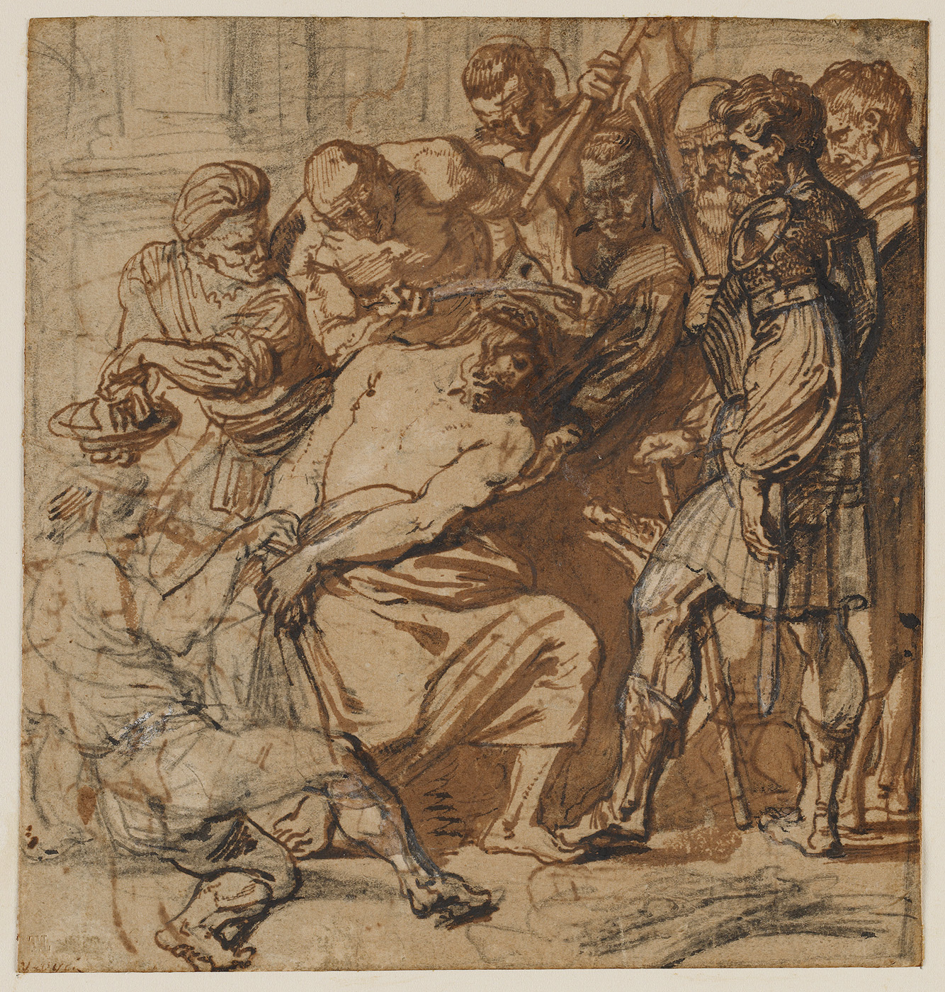 Dit blad maakt deel uit van een serie compositieschetsen voor Van Dycks Doornenkroning (ca. 1618) dat zich in het Kaiser-Friedrich-Museum in Berlijn bevond. Dit schilderij is in de Tweede Wereldoorlog vernietigd, waardoor we het werk alleen van een zwart-wit foto kennen. Samen met een gewijzigde versie van het Berlijnse werk in het Prado te Madrid, bieden de overgeleverde schetsen een inzicht in het ontwerp proces van Van Dyck. De opdrachtgever voor het Duitse schilderij is niet bekend, de eerste vermeldingen van het schilderij komen uit de achttiende eeuw.