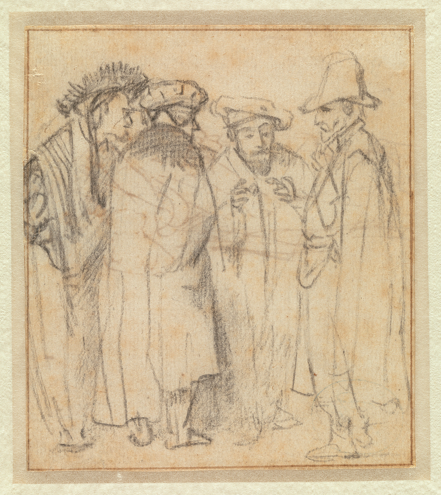 (?) Veiling Bernard 1834, p. 27, nr. 3: 'Een blad met Studiebeeldjes met zw. kr. , door denzelven (=Rembrandt) ' (f 81,-, Brondgeest) (dit kan ook cat. nr. 13 zijn geweest); Brondgeest (zie: Vosmaer 1868, p. 511: 'Acheté de M. Brondgeest f 106,50 par M. Verstolk); Veiling Verstolk van Soelen 1847, p. 7 nr. 29: 'Du Même (Rembrandt van Rhyn). Ètude à lapierre d'Italie de quatre hommes en discours; ils sont enveloppé de longs manteaux, trois d'entre eux sont couvert de bonnets et la quatrième est coiffé d'un chapeau. L'exécution est large et spirituelle' (f 88,-, Brondgeest) ; Legaat C.J. Fodor