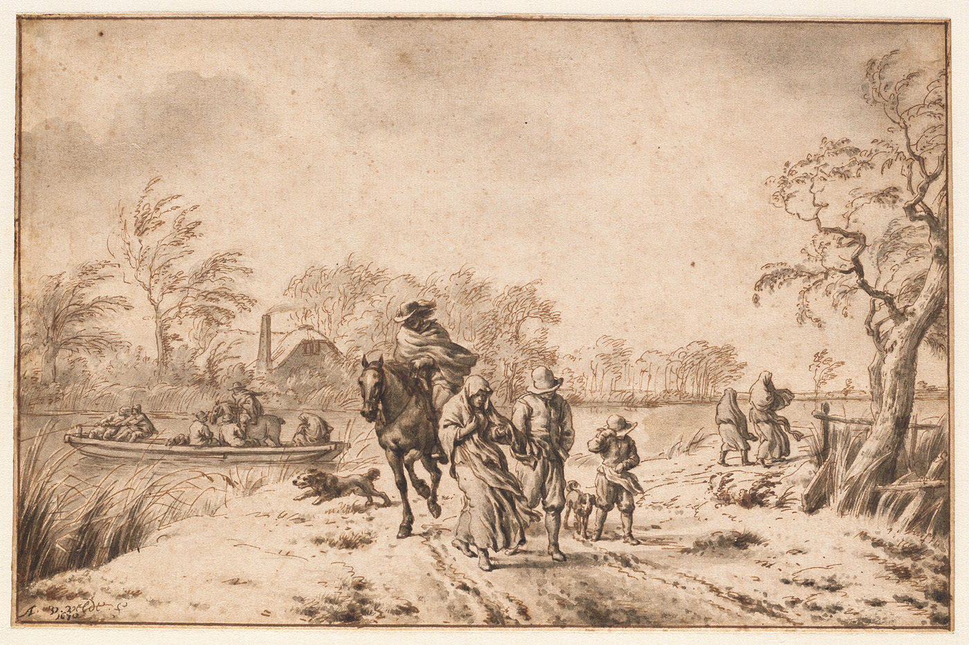 (?) Veiling Oudaan 1766, p. 43, Konstboek G, nr. 73: 'Een Landschapje, verbeeldende een Herfstbui, door A. v. Velde, met Oost-Indische inkt, zeer natuurlyk en fraai verbeeld' (f 166:-:-, aan Metayer); Veiling Ploos van Amstel 1800, p. 31, Kunstboek F, nr. 1: 'Gezigt langs een Weg met Geboomtes, gestoffeerd met een Heer te paard en verscheidene gaande Lieden; alles verbeeld zig by een sterke wind; verder ziet men een overvaarende Postschuit, met verscheidene Menschen & c., by boeren Woningen. Deeze uitmuntende Teekening is zeer uitvoerig met de Pen en Roet geteekend, door A. van de Velde. Hoog 6¾, breed 10¼ duim' (f 1000:-:-, aan Bernard); Veiling Saportas 1823, p. 27, Kunstboek A, nr. 1: ' Adriaan van de Velde. Deze bij uitstek fraaije Teekening, bekend onder den naam van den storm, verbeeld eenen omgaanden weg aan de zijde van een water, waarin een postschuit met een heer te paard wordt overgehaald; op den weg ziet men een man te paard, benevens een man en vrouw en een jongen hij eene hevige windvlaag; waarvan de uitdrukking zeer juist met bruine inkt is voorgesteld' (f 800:-:-, aan Hulswit); Veiling Van Cranenburgh 1858, p. 13, Portefeuille F, nr. 121: 'Le même (Adriaen van de Velde), l'an 1670. Le Passage du Bac, hiver pendant un bourrasque, le sol est couvert de neige, riche composition de figures, à la plume et lavé au bistre ; dessin d'un rare fini, Collection Ploos van Amstel 1800 et Collection S. Saportas 1832'(f 1010,-, aan Lamme voor Fodor) ; Collectie Fodor, legaat 1860