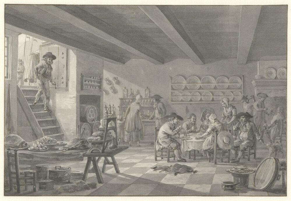 Dirk Langendijk, voornamelijk bekend om zijn oorlogstaferelen, waagde zich af en toe ook aan wat minder gruwelijke onderwerpskeuzes. Rond 1800 tekende hij verscheidene series, waaronder die van de maanden van het jaar, de jaargetijden, de leeftijden van de mens en de vier elementen. Deze vijf tekeningen vormen samen zo’n serie: die van de vijf zintuigen (TA 10653-7). De vijf tekeningen vormen duidelijk een set, aangezien ze elk op een bijna identiek formaat zijn getekend (ca. 135 x 200 mm), met dezelfde materialen en met allemaal dezelfde kaderlijn. Ook is elk van de tekeningen gedateerd en gesigneerd: elk van de tekeningen is gemaakt in 1799, behalve die van de reuk – die tekende Langendijk in 1800. Dergelijke allegorische scènes en reeksen werden al gemaakt sinds de middeleeuwen, als ‘leerrijke reeksen’: moraliserende werken, die de toeschouwer bepaalde waarden of wijsheden dienden bij te brengen. Rond het eind van de achttiende – en het begin van de negentiende eeuw waren zulke reeksen populair onder verzamelaars, wat zal verklaren waarom Langendijk ze maakte. “De vijf zintuigen” genoten echter over het algemeen minder populariteit dan andere reeksen, zoals die van de twaalf maanden.