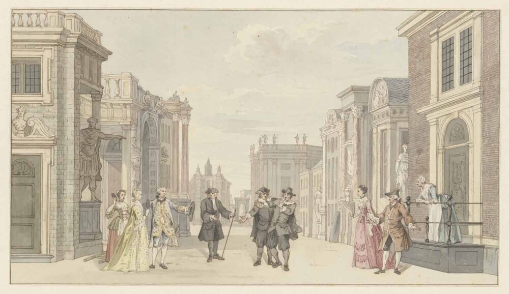 Uit het grote aantal prenten dat werd gemaakt van toneeldecors en -scŠnes blijkt de populariteit van het theater in de 18de eeuw. Het decor van 'de Italiaansche straat' is in prent gebracht door Adolf van der Laan (1684/90?-na 1740) naar een ontwerp van Hendrik de Leth (1703-1766). Ook Willem Writs vervaardigde prenten van toneelscŠnes in de schouwburg aan de Keizersgracht. ( Leonoor van Oosterzee)