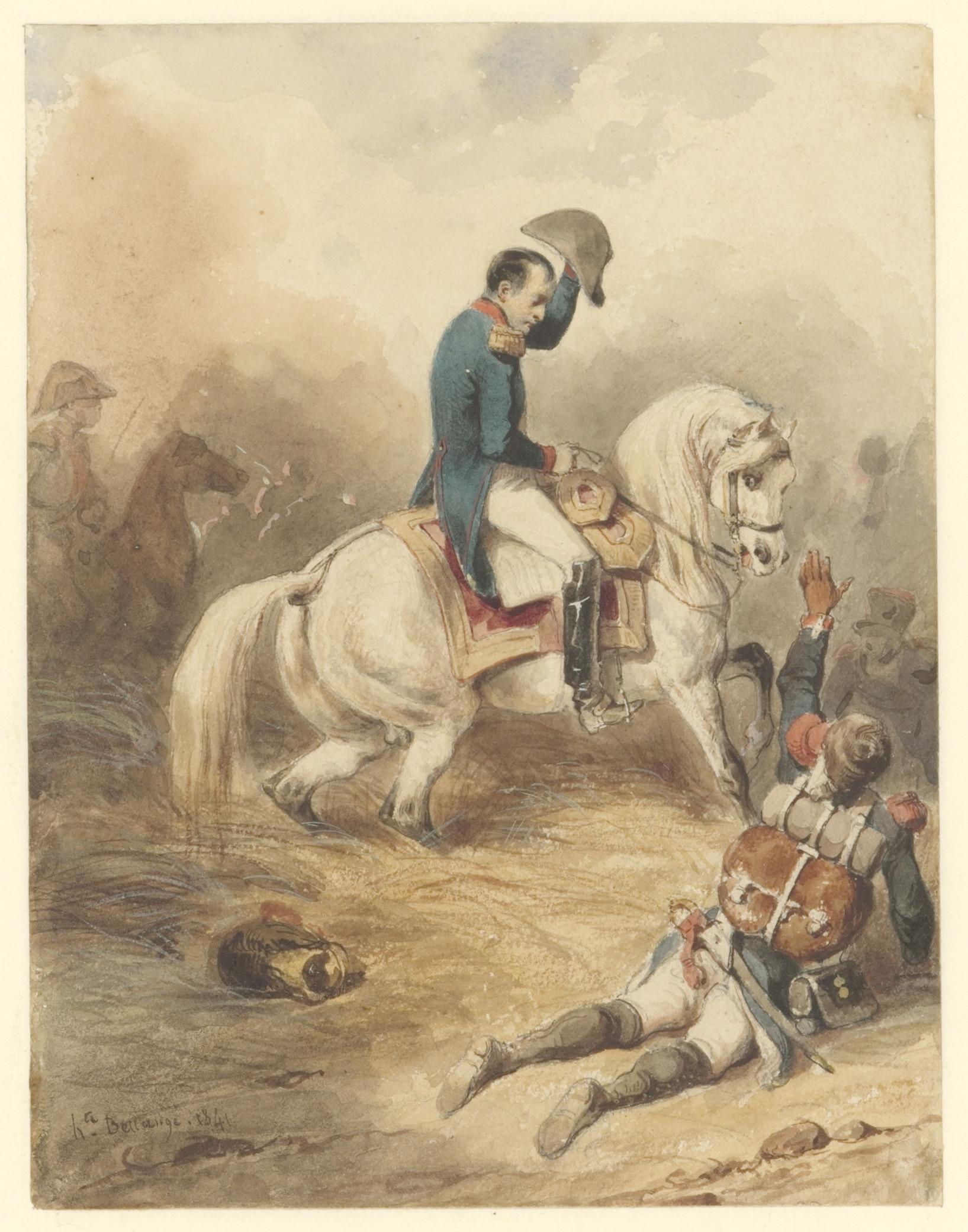 It seems that Bellangé made a similar watercolor in 1840, one year prior to this sheet. It is listed in the 1880 oeuvre catalogue as Napoleon à cheval saluant des blesses (present location unknown). The catalogue makes no mention of the Fodor drawing, which may have been acquired at the Wallace Sale in 1857. Bellangé evidently produced several variations on the theme of a mounted Napoleon riding across a battlefield from left to right. Two such watercolors, of 186 and 1837, are now in the Wallace Collection in London. The first shows the emperor at Waterloo, while in the second he is riding on a white charger at the head of his army.