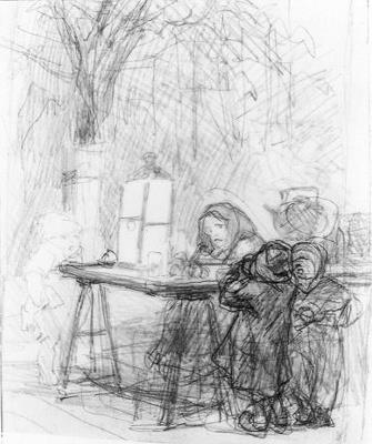 - Koopvrouw achter een schragentafel, Een aantal kinderen staan om de tafel., 1840 - 1881