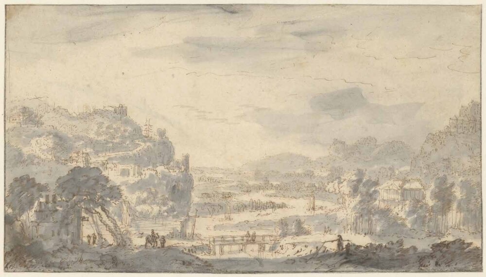 Het oeuvre van Abraham Rademaker bestaat voor het grootste deel uit tekeningen en prenten met Nederlandse topografische onderwerpen. Rademaker begon zijn carriŠre als tekenaar met het maken van arcadische landschappen en van panoramische fantasielandschappen met riviergezichten. Van dit op het werk van Herman Saftleven (1609-1685) gebaseerde rivierlandschap in Rademakers schetsmatige stijl, is geen uitgewerkte versie in gouache of inkt bekend. ( Ingrid Oud)
