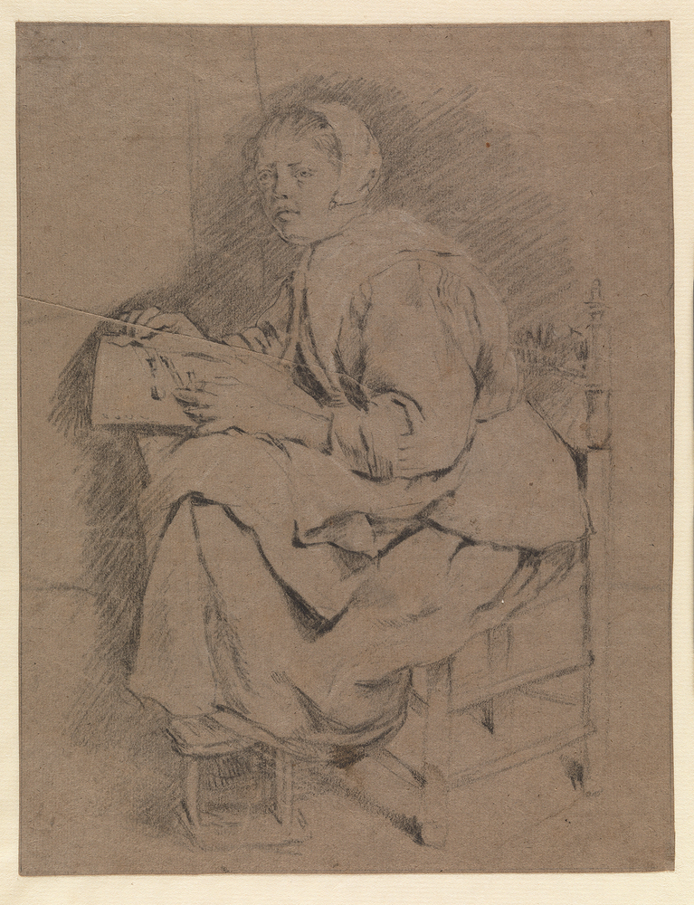 Veiling Mensing 1937-A, p. 47. nr 442: ' Gabriel Metzu. La dentellière. Elle est assise et vue de trois quarts à gauche, tenant le pied gauche sur une chaufferette. Pierre noire. -Haut 25.1, larg. 19.6 cent.' (f 38,- aan Altena); Aankoop 1937 (Jaarverslag 1938, p. 15)