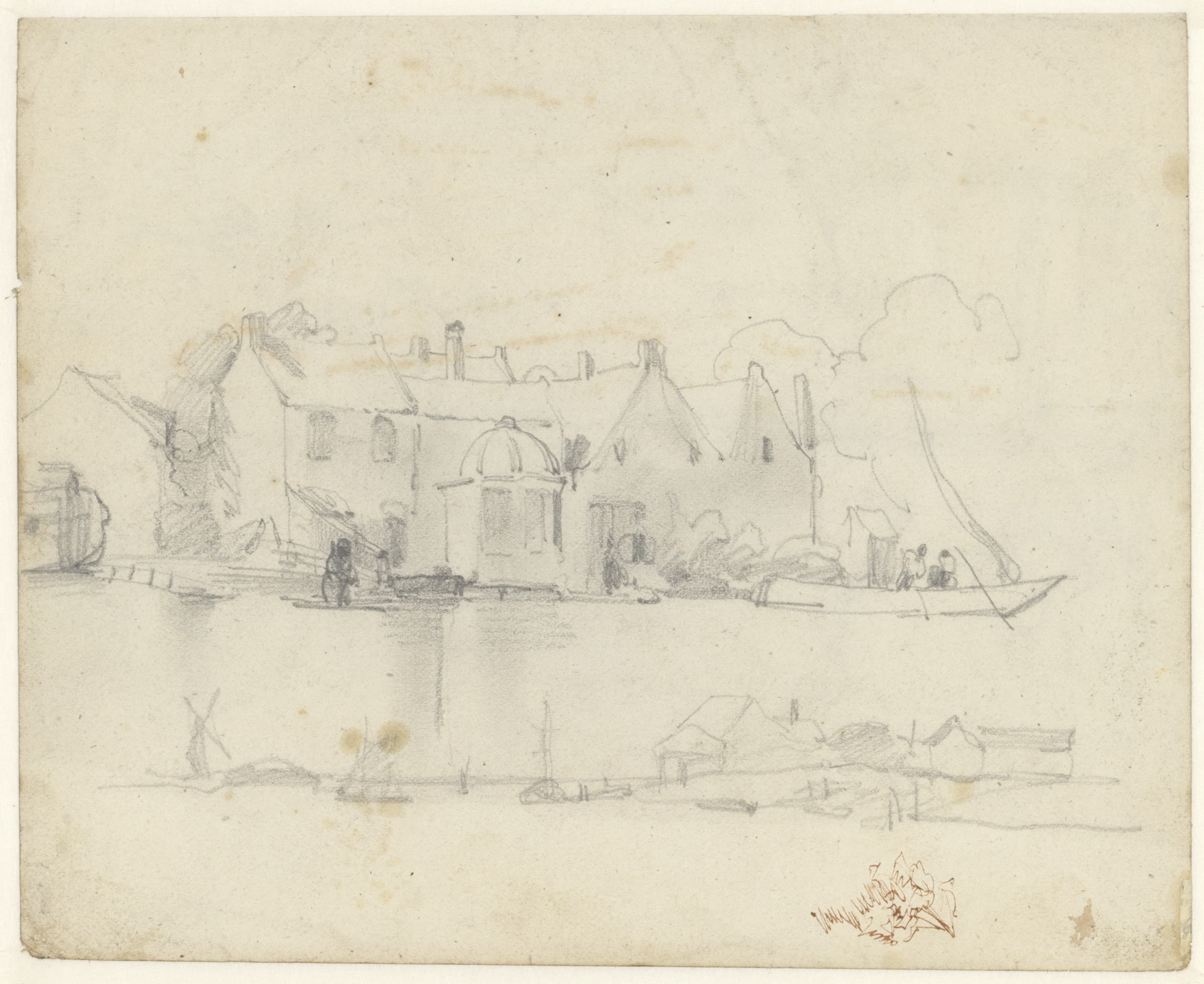- Studieblad met riviergezicht en rivier met koepel en huizen. verso: bootsromp bij een boothuis op het land, 1844 - 1903