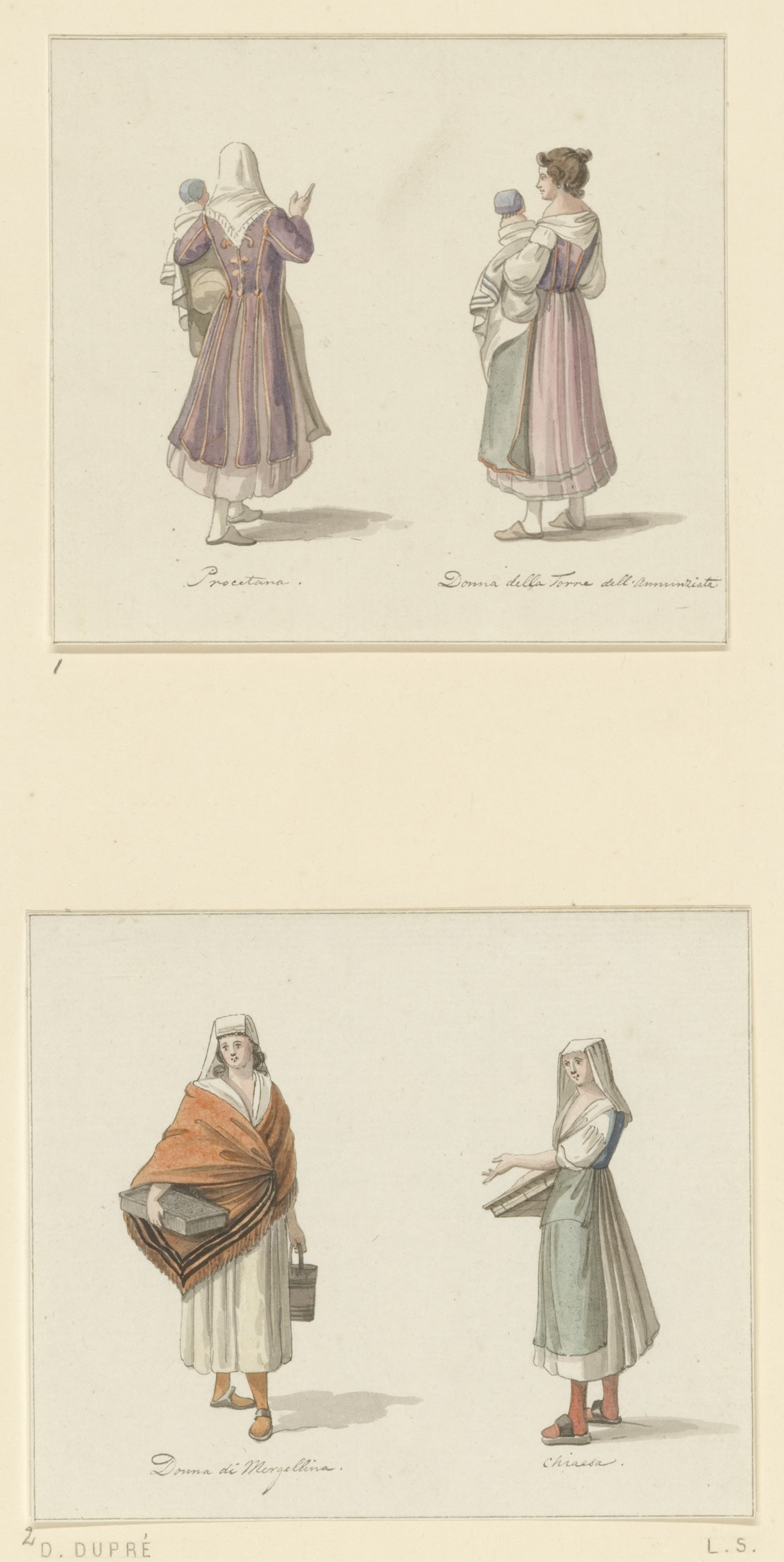 Dupré tekende in Italië voornamelijk veel landschappen, die hij in sommige gevallen als gravure verspreidde. Het is goed mogelijk dat hij ook vellen als deze, waarop hij de dracht van Italiaanse vrouwen natekende, naar Nederland stuurde. De twee op het eerste blad dragen beide een paarse jurk en een kind op de arm. Dit soort figuur- of kostuumstudies, waarop één figuur tegen een witte achtergrond werd afgebeeld met daaronder een kort onderschrift, was populair in Italië; het is dan ook waarschijnlijk dat Dupré deze tekeningen op zijn reis maakte. De onderschriften, Procetana en Donna della Torre dell’Annunziata, duiden er beide op dat deze vrouwen uit Napels komen. Er is een zeer vergelijkbare prent van een Italiaanse vrouw in kostuum bekend, tevens een rugfiguur, met als onderschrift “Procetana, femme d’etats de Naples.’ Procetana komt van Procida, een klein eiland voor de kust van Napels en Torre dell’Annunziata is een stad in de buurt van Napels. Dupré kan ze dus in deze regio gezien en getekend hebben.