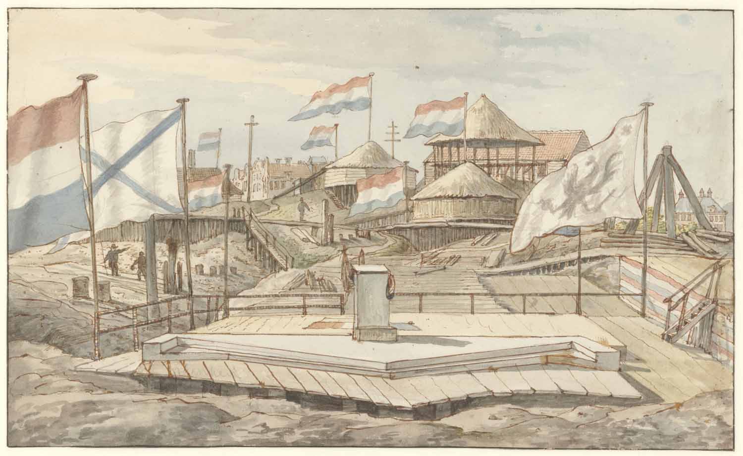 - Het leggen van de eerste steen van de Westerdoksluis 19 september 1832. "Het versierd Terrein", 1832
