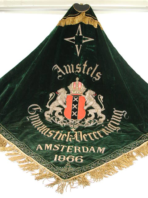 Vaandel van donkergroen fluweel. Aan voorzijde, van boven naar beneden geborduurd met goudkleurig cantilledraad: in bovenhoek zijn vier V's in een cirkel geplaatst, samen een open ster vormend; daaronder in sierletters de tekst Amstels / Gymnastiek Vereeniging / Amsterdam / 1866. Centraal in het vaandel geaplliceerd is het stadswapen met de keizerskroon. De applicatie van de kroon bestaat uit karton overtrokken met rood fluweel, afgewerkt met cantilleborduursel, gekleurde stenen en imitatieparels. Het wapen zelf is met rood laken, donkerblauw fluweel en de drie kruisen is in cantilleborduursel. De leeuwen aan weerszijden van wapen is in cantilleborduursel. De onderzijde van het vaandel heeft een rand van in elkaar grijpende golvende lijnen van cantilleborduursel en is afgezet met goudkleurige franje. Vaandel is gevoerd met zwart satinet.