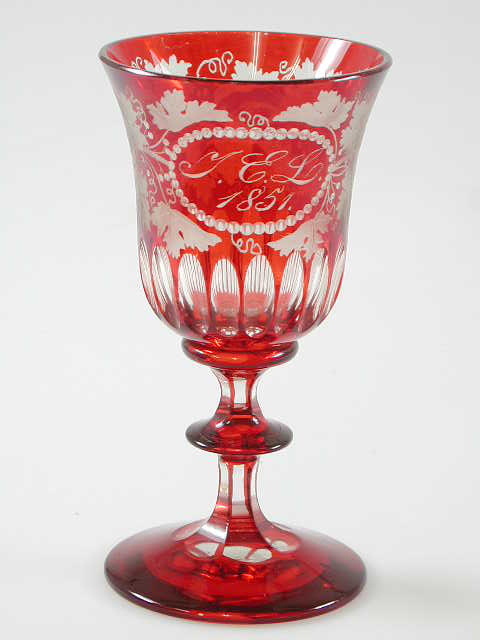 Rood wijnglas, met gravering: I.E.L./1851.- Trefwoorden