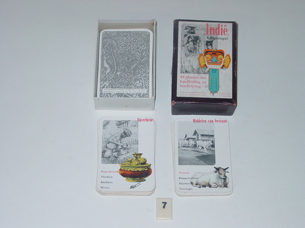 Indie-kwartet, Insulinde-kwartet. Verschillende aspecten van onze vroegere kolonie weergegeven in categorieen als 'woningen', 'vervoer', 'spelen', etc. De spelers stellen groepen van vier kaarten samen door bij toerbeurt kaarten op te vragen. Inhoud: 12 groepen van 4 kaarten (compleet); kartonnen doos; boekje met uitleg over de plaatjes.- Trefwoorden