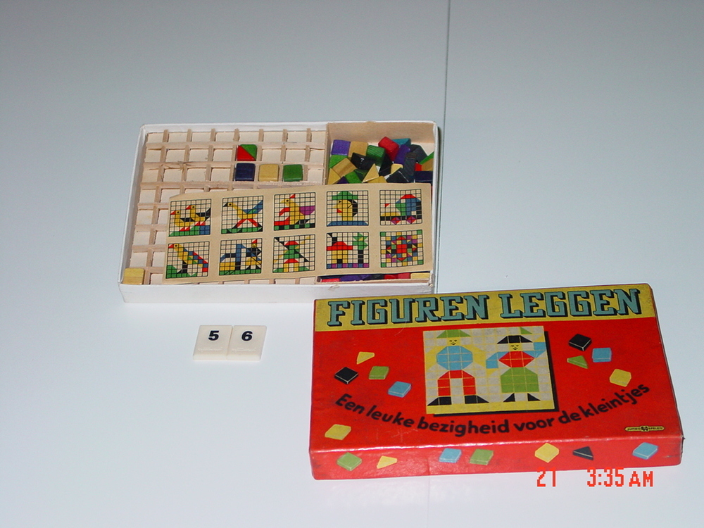 Spel waarbij m.b.v. gekleurde blokjes figuren gelegd kunnen worden in het daartoe bestemde rooster. Inhoud van rechthoekige doos met deksel: geklemde houten blokjes (driehoekig en vierkant); houten rooster; blaadje met voorbeelden.- Trefwoorden