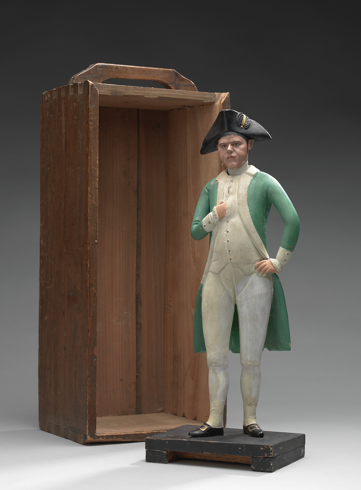 1. Polychroom beeldje op voetstuk. Staande man, frontaal gezien. Driekantige, zwarte steek, wit vest en broek. lichtgroene jas. 2. Oorspronkelijke verpakking: rechthoekig houten kistje met schuifdeksel, aan de bovenzijde een handgreep.