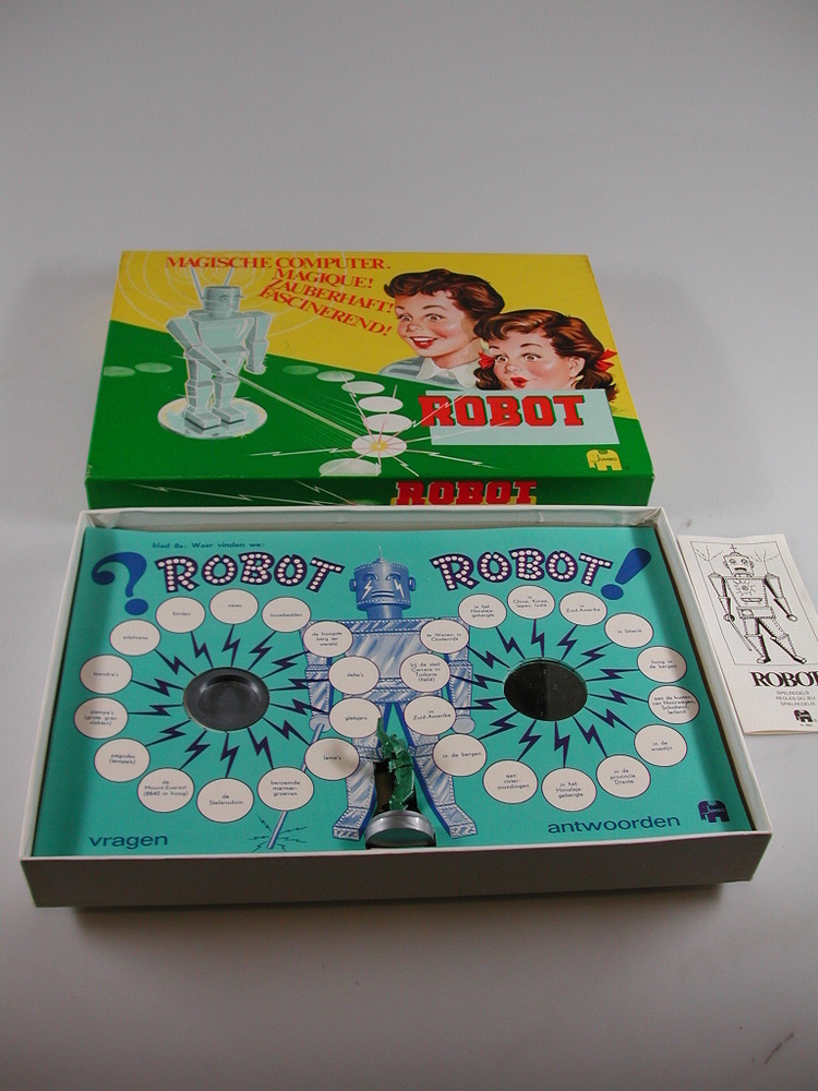 Vraag- en antwoordspel. Als de robot op 1 van de vragen wordt ingesteld wijst hij met zijn aanwijzer na plaatsing bij de antwoorden, door magnetisme, automatisch het juiste antwoord aan. Inhoud: vier vellen met vragen en antwoorden, robot, spelregels, garantiebewjis.- Trefwoorden