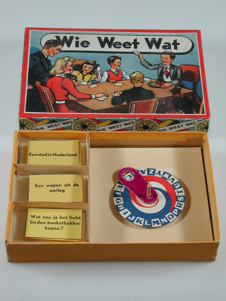 Voorloper van Pim Pam Pet. Vraag en antwoord spel. Inhoud doos bestaat uit draaischijf en kaartjes met vragen.- Trefwoorden