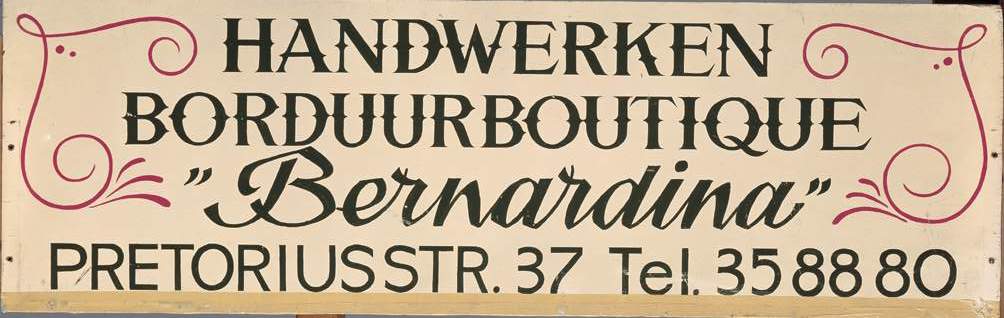 - opschrift: HANDWERKEN/ BORDUURBOUTIQUE/ "BERNARDINA"/ PRETORIUSSTR. 37 Tel. 358880