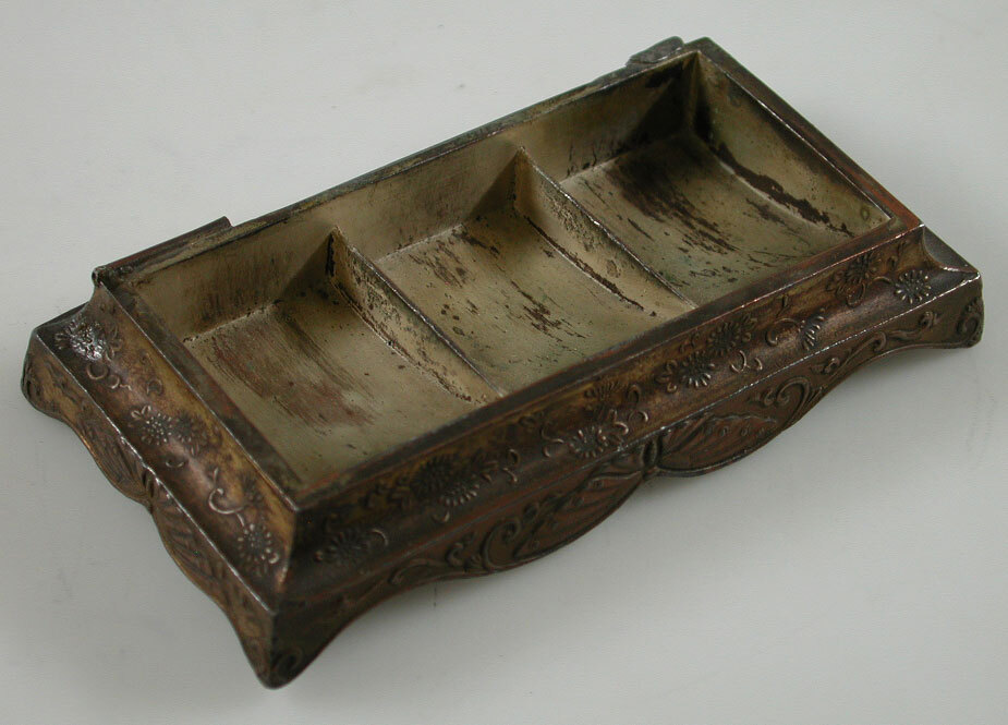 Verzilverd bronzen postzegelbakje met drie vakjes. Zonder deksel. Gegoten met bloemen- en vlinderornamentjes.- Trefwoorden