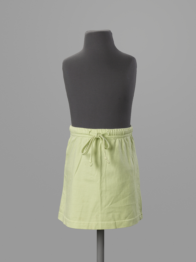 Appelgroen kort rokje van katoen met elastiek in de taille en sluiting d.m.v. koordje.