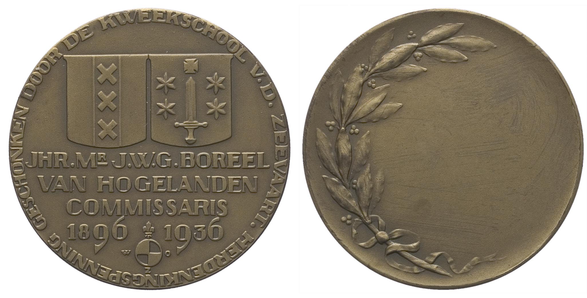 opschrift voorzijde: JHR.MR.J.W.G.BOREEL / VAN HOGELANDEN / COMMISSARIS / 1896 1936