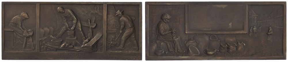 voorzijde: langwerpige rechthoekige liggende penning in de vorm van een drieluik waarop drie figuren bezig met het pottenbakkersambacht. Links kneed een vrouw de klei; in het midden draait een man een pot; rechts stookt een man een vuur om de potten te bakken.