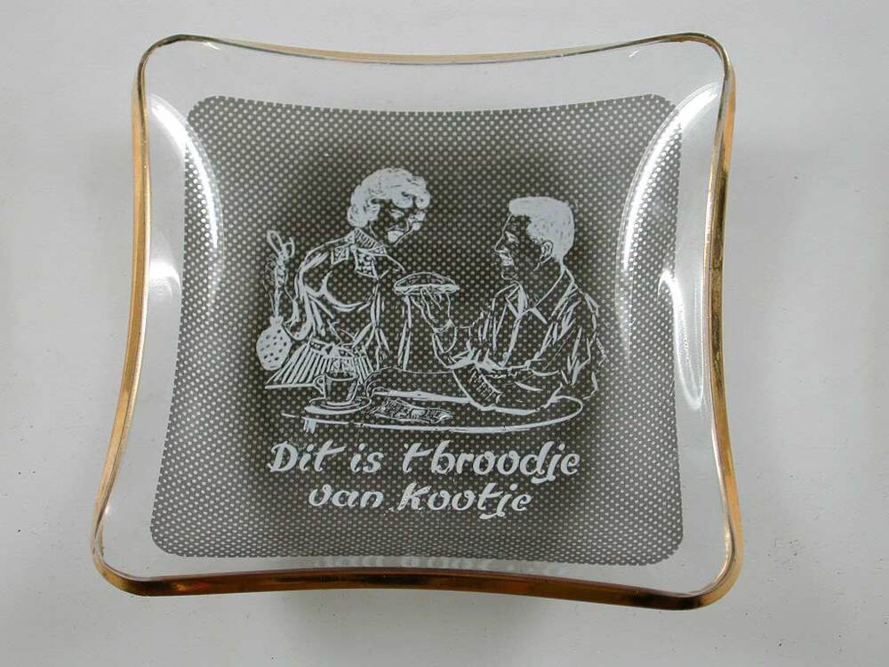 In de museumcollectie zit deze afgebeelde glazen asbak (uit de jaren 1950-’65) waarop een bediende staat met een klant voorzien een fors broodje en een kopje koffie. De broodjeszaak Broodje van Kootje was één van Nederlands meest authentieke en gerenommeerde broodjeszaken. ( Frans Oehlen)