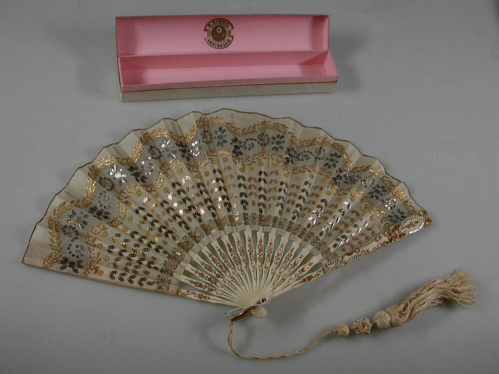 Vouwwaaier met zilveren en gouden pailletten op blad van gaas, beschilderde en bewerkte benen, met geelkoperen sluitring met cremekleurige kwast.