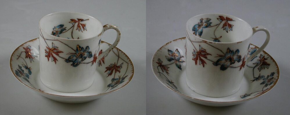 Deze twee kop-en-schotels komen uit het bezit van de Amsterdamse architect Abraham Salm (1857-1915). Samen met zijn vader Gerlof Bartholomeus Salm (1831-1897) heeft Abraham een grote bijdrage geleverd aan de stedenbouwkundige veranderingen in Amsterdam in de tweede helft van de negentiende eeuw. Waar G.B. Salms naam onlosmakelijk verbonden is met de bouw van Artis in de Plantage, staat zoon Abraham vooral bekend om zijn herenhuizen, stadsvilla’s, (sigaren)fabrieken en paardentramremises, aanvankelijk in classicistische, later in meer historiserende eclectische stijl. Daarnaast ontwierp hij ook interieuronderdelen. Deze kop-en-schotels zijn afkomstig uit het door A. Salm ontworpen huis aan de Weesperzijde 26, waar hij zelf woonde en werkte. Ze hebben in het koffiekastje gestaan in het tuinhuisje van Salm. ( Sarah Remmerts de Vries)