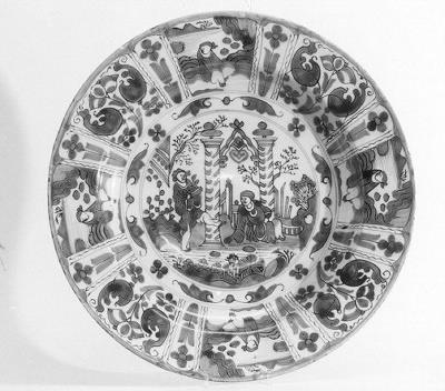 rand: zittende Chinese figuren en bloemen; midden: 2 Chinese figuren voor poort; achterkant: cirkels en strepen- Trefwoorden