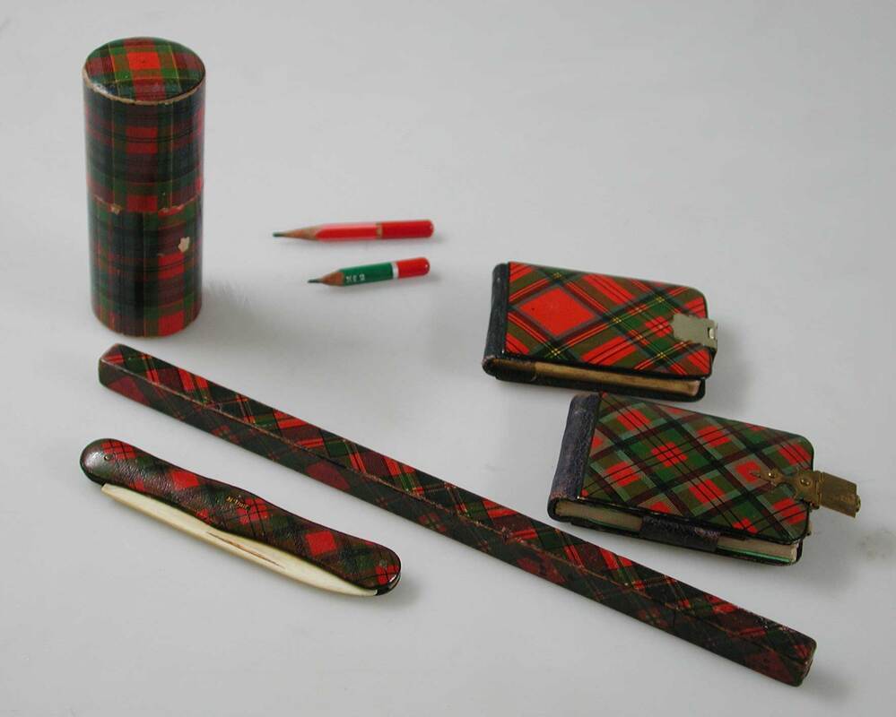 1. kokerdoosje met etiketjes 'McPherson'; 2. twee potloodjes; 3. notitieblokje 'Stuart'; 4. notitieblokje 'McDuff'; 5. briefopener 'McDuff'; 6; lineaal- Trefwoorden