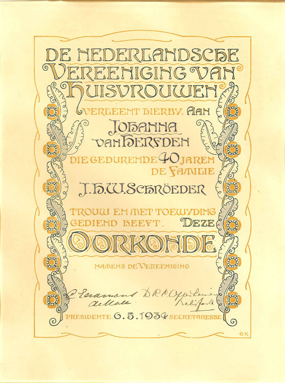 - Diploma van Johanna van Herfden i.v.m. 40 jaar trouwe dienst bij fam. J.H.W. Schröeder (1934), 1934