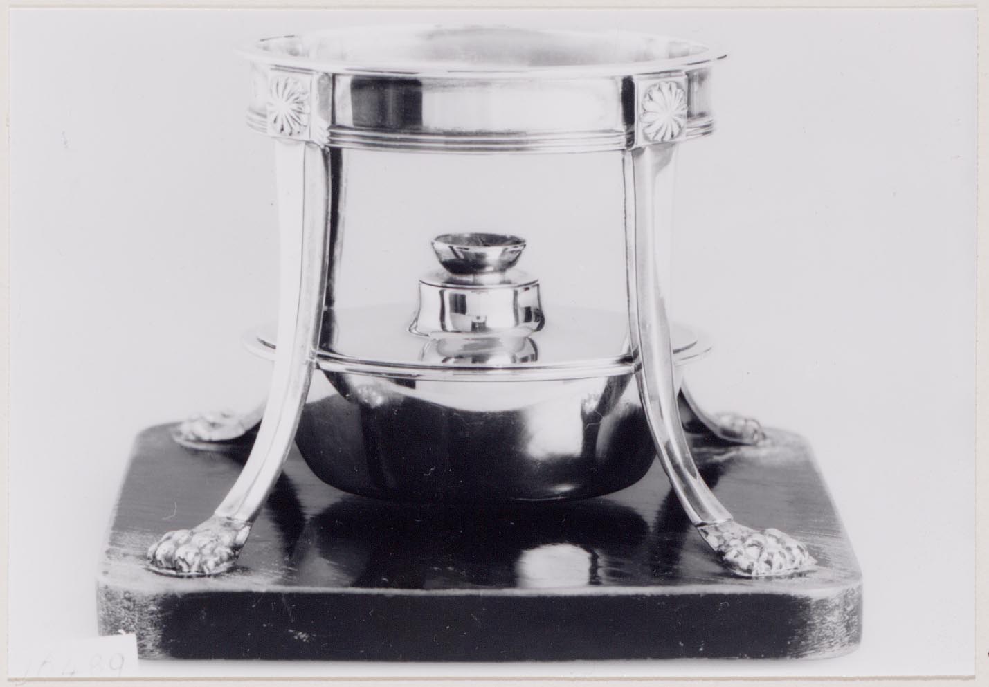 Ovaal komfoor op voetstuk van zwart gekleurd vruchtenhout, met gladde ring tussen filetranden en vier gebogen poten, de onderzijde uitlopend in leeuwenklauwen, de bovenzijde met vierkante velden waarin rozetten. Tussen poten een ovale brander steunend op ring.