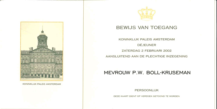 - Bewijs van toegang voor lunch in het Koninklijk Paleis t.g.v. huwelijk van Prins Willem-Alexander en Máxima Zorreguieta op 2002-02-02, 2002