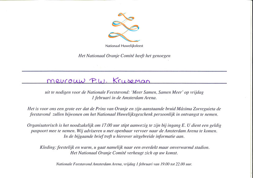 Trefwoorden uitnodiging, huwelijk, Bijlmer, Koninklijk Huis, Koning der Nederlanden Willem-Alexander Claus George Ferdinand, Prins van Oranje-Nassau, Jonkheer van Amsberg, prinses der Nederlanden Máxima, prinses van Oranje-Nassau, Nationaal Oranje Comité, Amsterdam Arena, Pauline W. Krusemandocumentencollectie Amsterdam Museum