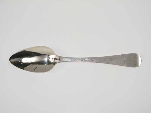 Tafellepel uit de negentiende eeuw, steel met middenribbe en omhoog gebogen ronde kop, aan de achterzijde dubbel Amsterdams lof, ovale lepelbak. Op onderzijde steel is een monogram gegraveerd met de initialen: D.I.A./ O.V.H./, de afkorting van Diaconie Oude Vrouwenhuis, alsmede de namen van de diakenen en diaconessen en het jaar van hun aantreden in die functie.