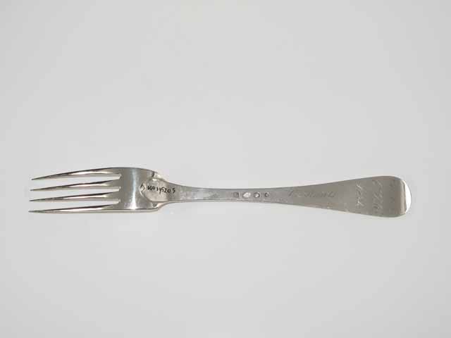 Tafellvork uit de negentiende eeuw, steel met middenribbe en omhoog gebogen ronde kop, aan de achterzijde dubbel Amsterdams lof. Op onderzijde steel is een monogram gegraveerd met de initialen: D.I.A./ O.V.H./, de afkorting van Diaconie Oude Vrouwenhuis, alsmede de naam van diaconesse en het jaar van aantreden in die functie.