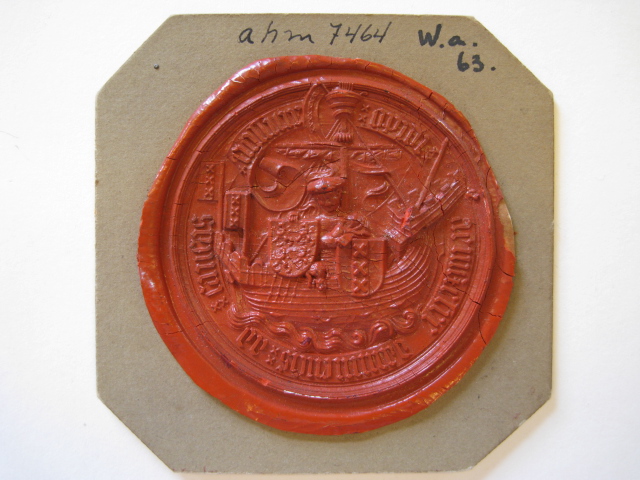 Dit zilveren zegel werd gebruikt voor belangrijke stukken. Het handvat heeft de vorm van een leeuw. De afdruk vertoont het koggeschip.