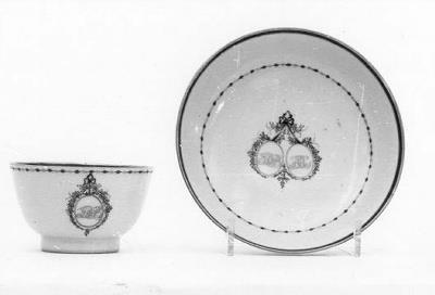 rond kopje zonder oor met diep schoteltje. Décor van médaillons aan paars lint met vergulde monogrammen ADB en HFAC- HerkomstTheeservies voor 350 gulden op 29 mei 1889 door S.A. Lopez Suasso-De Bruijn aangekocht; legaat van mevrouw S.A. Lopez Suasso-de Bruijn, Amsterdam, 1890.