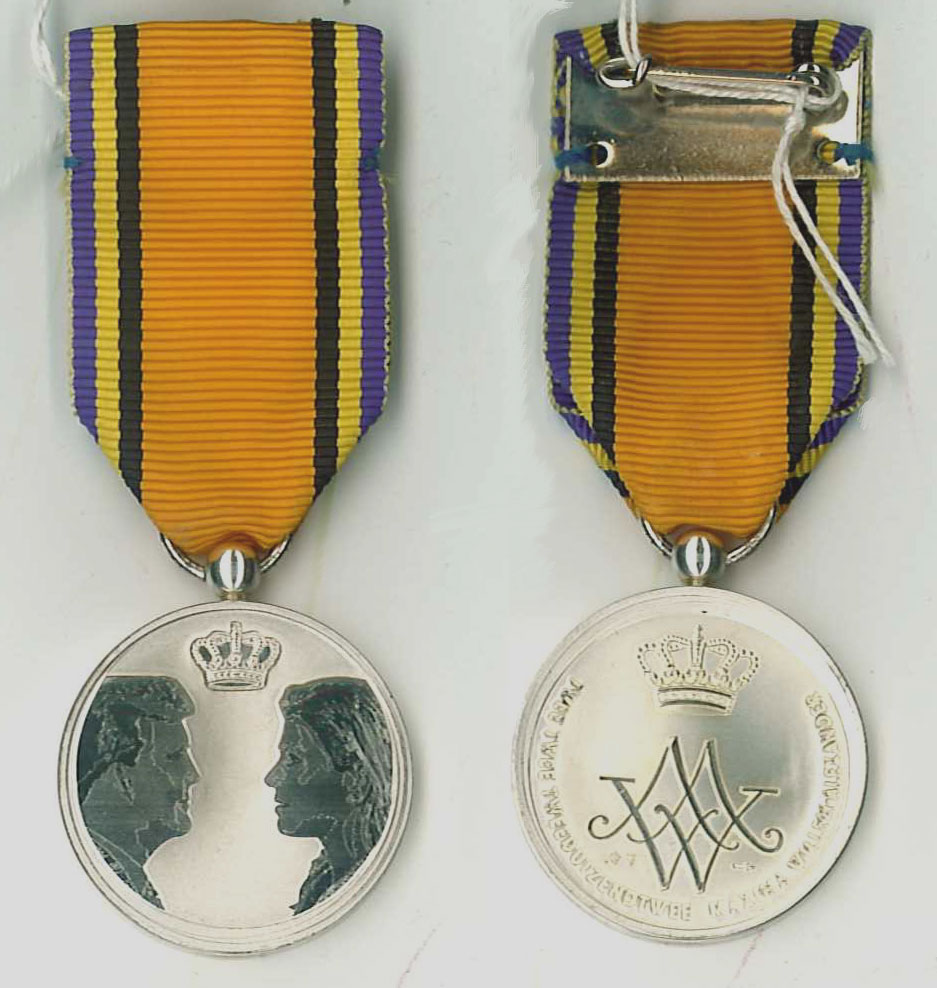 Huwelijksmedaille 2002, 2002 zilver, lint hoogte: 7.9 cm; breedte: 3 cm; diepte: 0.3 cm; tekst verso: TWEE TWEE TWEEDUIZENDTWEE MÁXIMA WILLEM-ALEXANDER