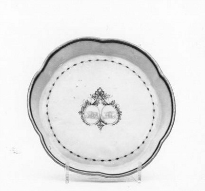 rond, opstaande geschulpte rand. Décor van médaillons aan paars lint met vergulde monogrammen ADB en HFAC- HerkomstTheeservies voor 350 gulden op 29 mei 1889 door S.A. Lopez Suasso-De Bruijn aangekocht; legaat van mevrouw S.A. Lopez Suasso-de Bruijn, Amsterdam, 1890.