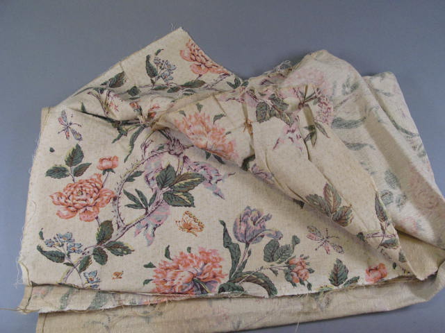 Fragment van de bekleding van de meubels uit de tuinkamer van Willet-Holthuizen. Ecru kleurig katoen damast bedrukt met bloemmotief in de kleuren roze, oranje, aubergine, groen, bruin en zacht blauw. Van het fragment is een deel afgeknipt.- Trefwoorden