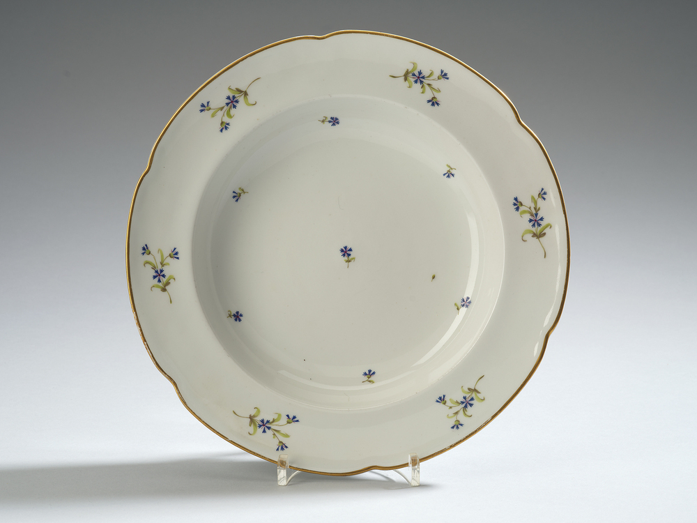 Diep. gecontourneerd bord beschilderd met korenbloemen. Merk: M.o.L. en ster- Trefwoorden