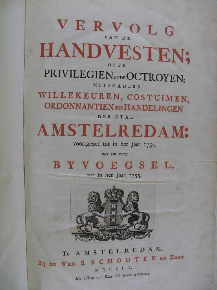 - Vervolg van de Handvesten; ofte Privilegien ende Octroyen; Mitsgaders Willekeuren, Costuimen, Ordonnantien en Handelingen der Stad Amstelredam: voortgezet tot in het Jaar 1754. met een nader Byvoegsel, tot in het Jaar 1755